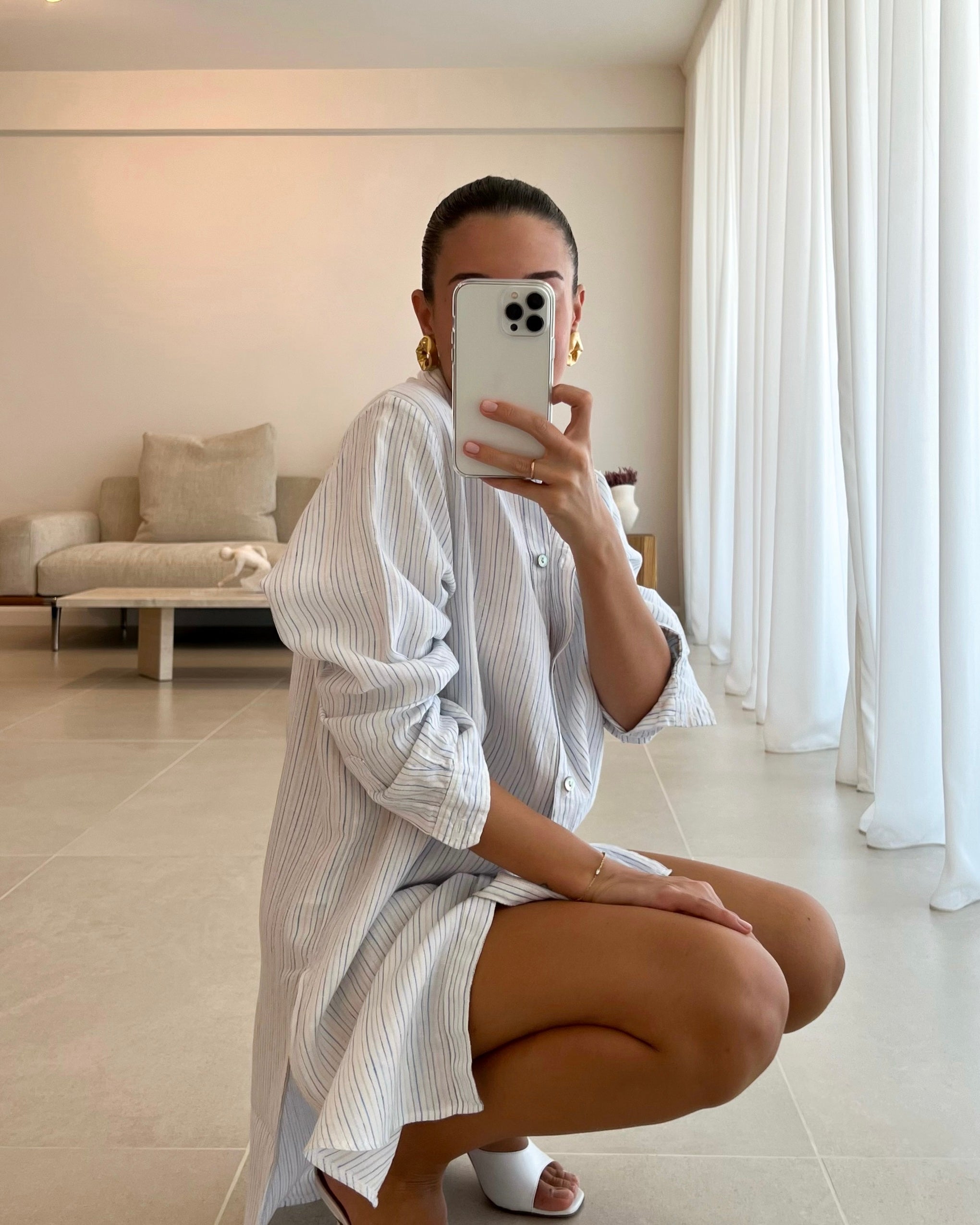 Our Nate Boyfriend Shirt is perfectly oversized for comfort and ease. Features side spilts for a more casual and effortless look, mother of pearl shell buttons glimmer alongside the natural crinkle fine stripe linen fabric. Layer over your swimwear or pair with shorts and sandals on vacation.
